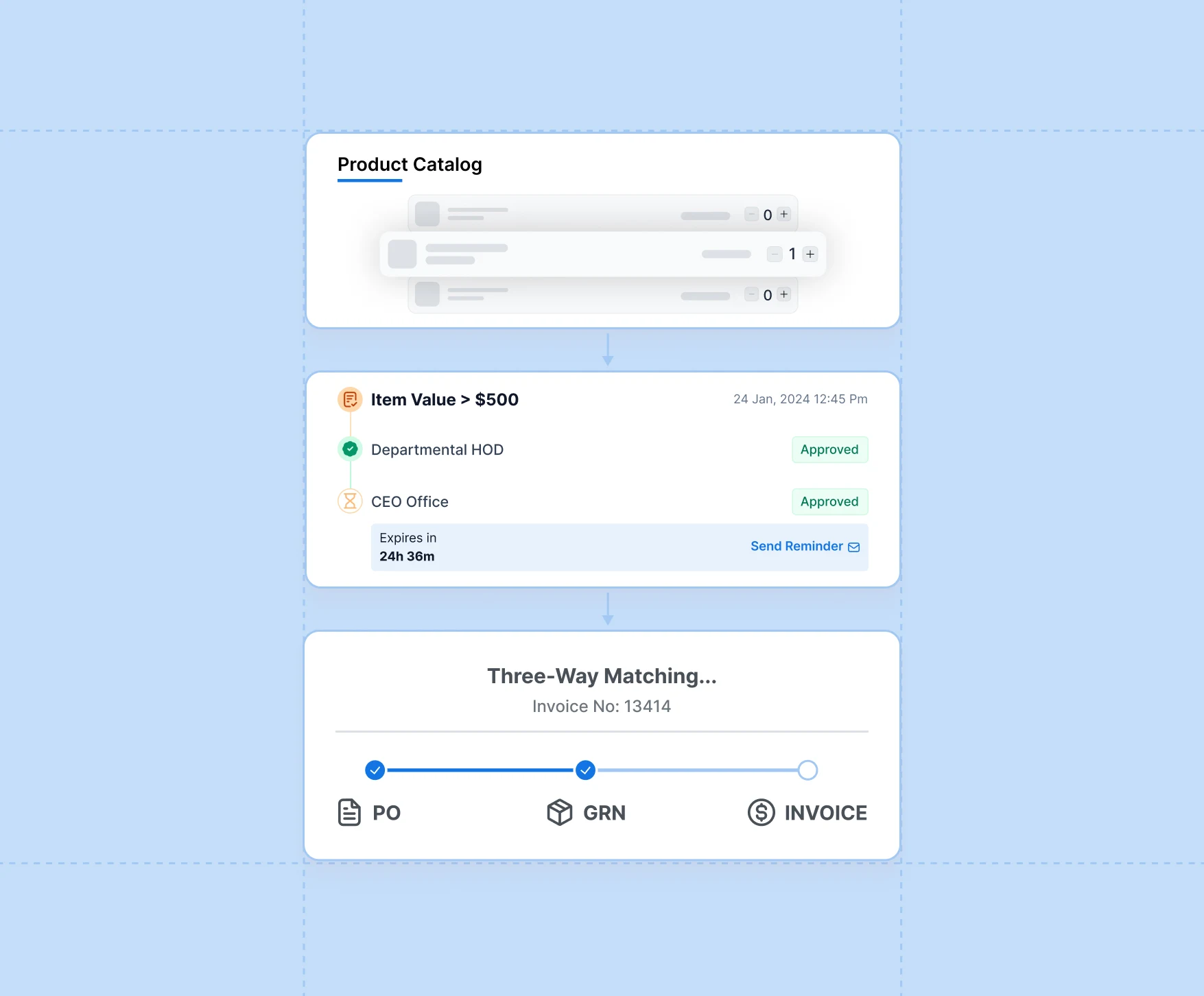 Streamline everything from intake to payment with complete visibility to the end users, suppliers, and stakeholders. Automatically convert PR-to-PO, handle invoicing, GRN, and ASN, while also having touchless 3-way matching.