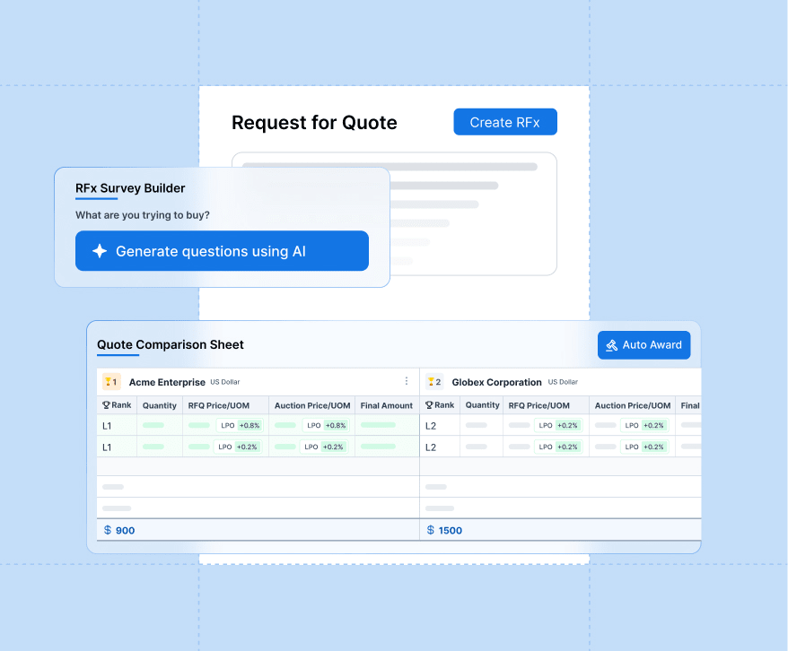 Launch RFXs in minutes with Procol’s AI-powered eRFX module. Automatically generate multiple events for different items and convert quotes into eAuctions with a single click, driving competitive pricing without the need for manual negotiations.